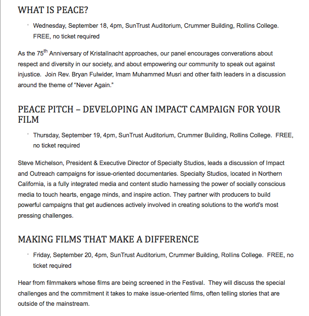 In addition to the film showings, the festival will be hosting several open panels – completely free for attendees – for aspiring filmmakers, peace advocates, or those just interested in learning more about the causes behind the films and the production methods to create them.